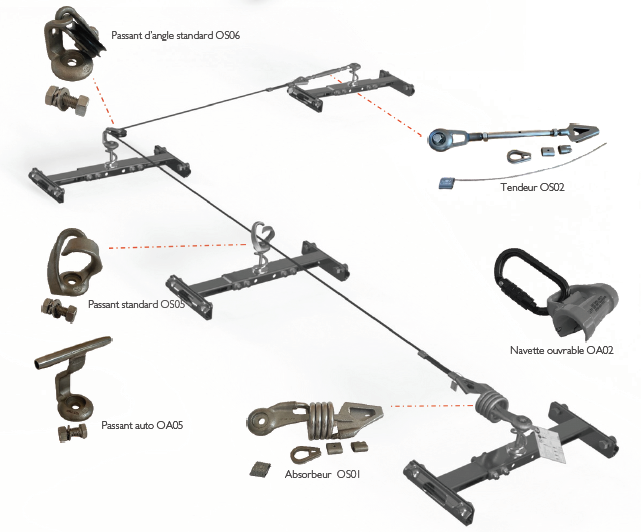 Les lignes de vie peuvent être utilisées par 4 personnes, les utilisateurs peuvent se connecter sur ces lignes de vie avec les navettes prévues à cet effet.